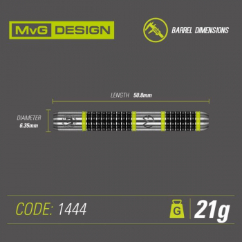 Spezifikation: 80 % Tungsten, Shafts: MvG Design Nylon medium, Flys: MvG Prism Delta Standard extra dick, mit Mvg-Logo und Winmau-Logo lasergraviert.