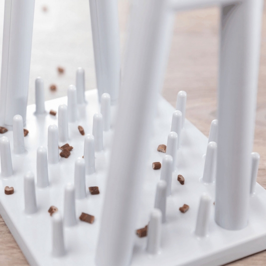 Das Verstecken von Leckerlis in den Bechern wird das Interesse Ihrer Katze wecken. Sie erspäht die Belohnung und versucht sie durch Strategie, Geschicklichkeit und Ausdauer zu erbeuten. Nach einer gewissen Übungszeit gelingt es ihr, die Becher mit ihrer Pfote zu drehen, bis einige Leckerlis auf die Grundplatte mit den Zapfen fallen. Mit ein wenig 'Pfoten-Geschick' kann sie ihre Belohnung dann herauspföteln.